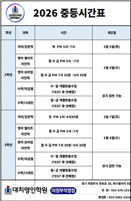 2026 중등 , 고등 시간표